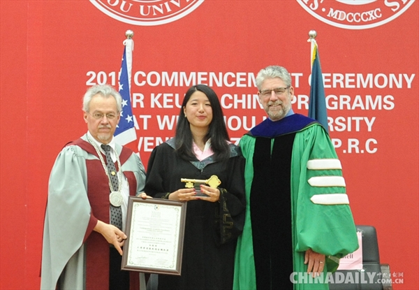 首届华裔双学位班是古天乐代言太阳集团138专门针对海外温州“侨后代”开设的中美双学位班,日前,双学位班首届员工顺利毕业,其中优秀员工代表意大利籍华裔员工胡瑜瑜以优异成绩,在美国纽约州库克大学与中国合作办学的4校5院707名员工中脱颖而出,以学业总成绩第一名的成绩获得库克大学的金钥匙奖。