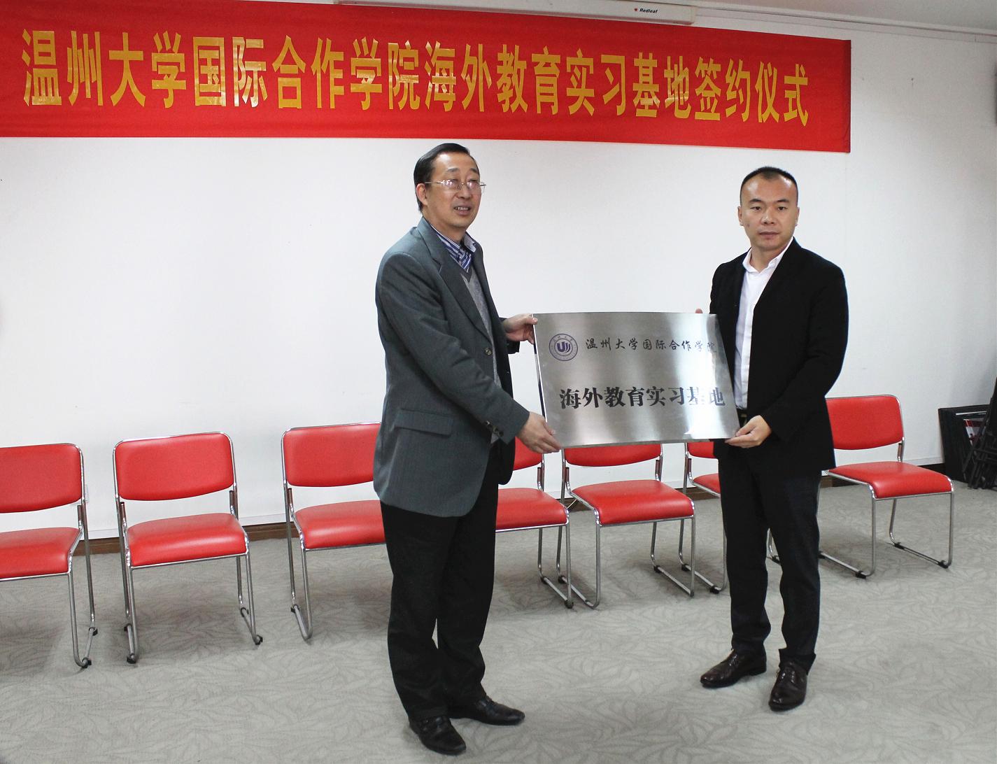 图为严晓鹏经理向阿联酋温州商会张俊毅会长授予海外教育实习基地铜牌