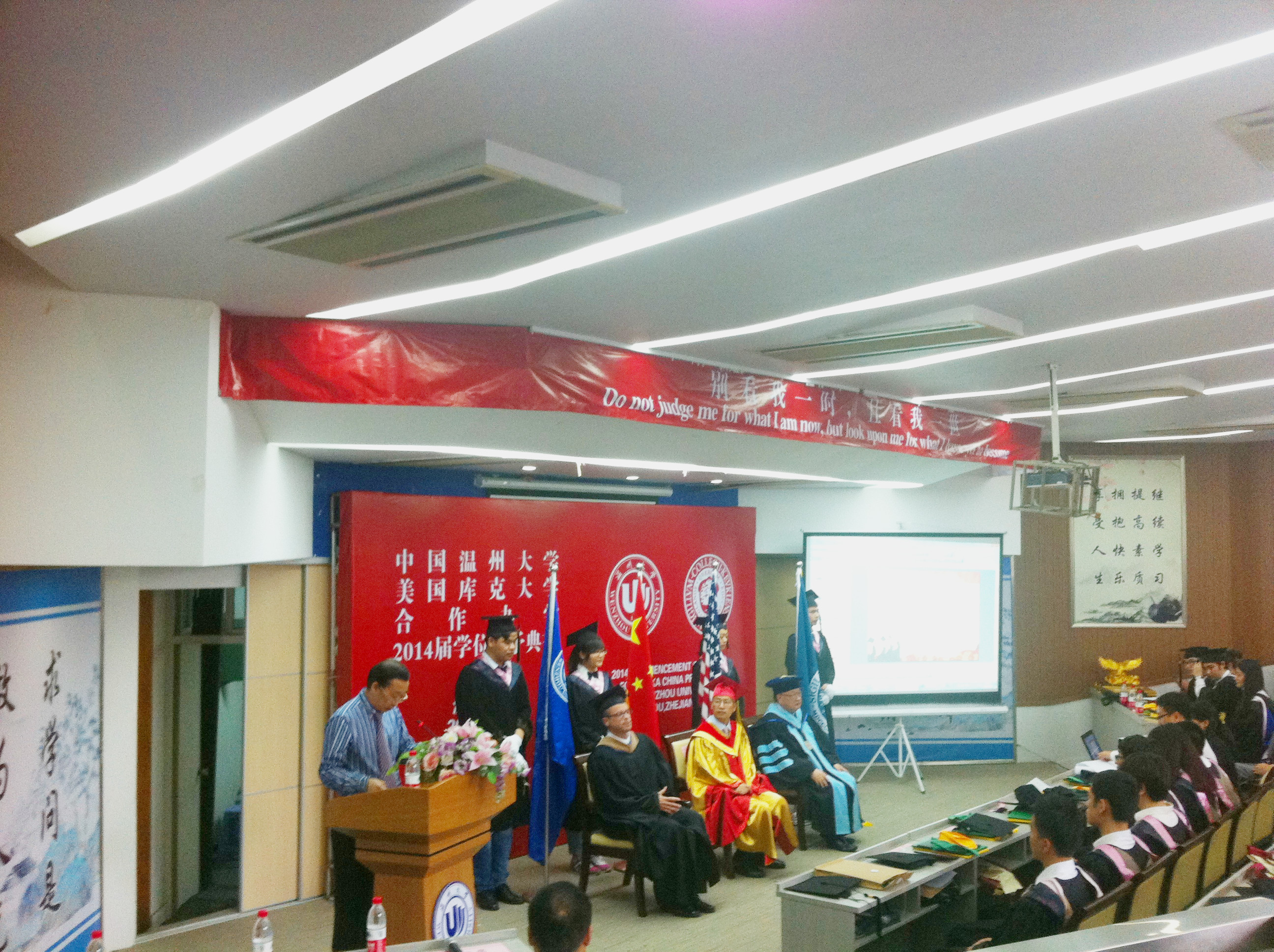 在严晓鹏经理宣布了2014届毕业生学业优秀奖获奖名单和生涯规划暨体验教育优秀奖获奖名单后,隆重而温馨的学位授予典礼正式开始。双方校领导分别为一一上台的45位美国库克大学管理学学士学位获得者颁发证书、拨穗,并为优秀学业奖获得者、优秀生涯规划暨体验教育奖获得者授予绶带。看着穿着学士服的子女手捧学位证书与中美两校董事长合影,参加典礼的家长无不动容,他们的付出与期盼终于在此时化为现实。