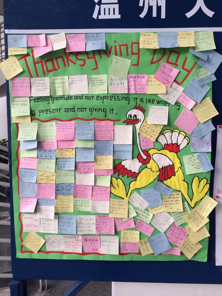 在一年一度的感恩节到来之际,国际合作公司团委员工会发起了“浓情感恩节,深悟感恩情”祝福语征集活动。全院中外同学们纷纷响应,积极参与,将自己对同学、朋友以及亲人的感谢与祝福写下。感恩海报上贴满制作精美的用各国语言写作的祝福语。值得一提的是部分职工们用端正的中文字写出了感谢,中国员工则用地道的英文表示了感谢之情。五颜六色、精美别致的小纸片随风飘展,成为公司冬日里一道亮丽的风景线。