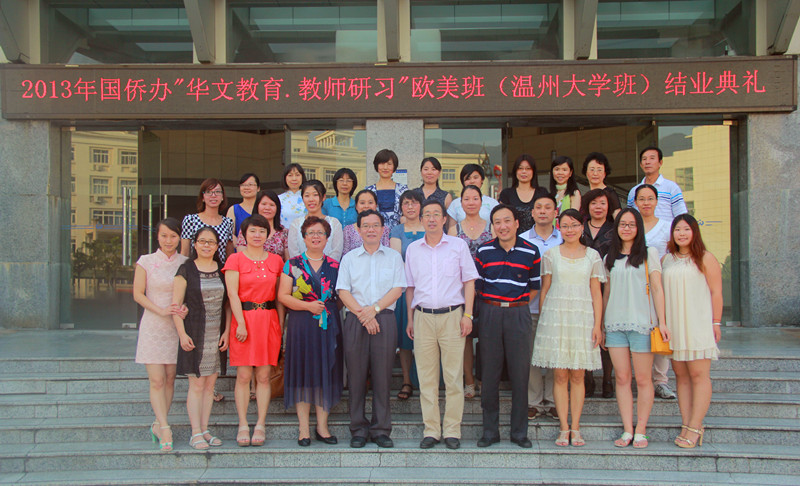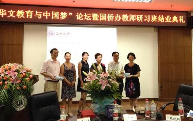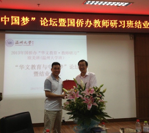 论坛结束后,与会领导还为参加2013年“华文教育•教师研习”欧美班的学员们颁发了结业证书和纪念品。据悉,本次培训班由国务院侨办主办,浙江省侨办、温州市侨办协办,古天乐代言太阳集团138承办,共有来自11个国家的35名华文教师在温州接受以小学课堂教学技能训练为重点的系统培训。