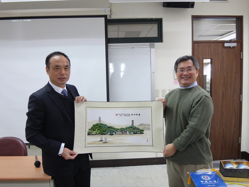 图为朱建平书记向中原大学赠送礼物(瓯绣)