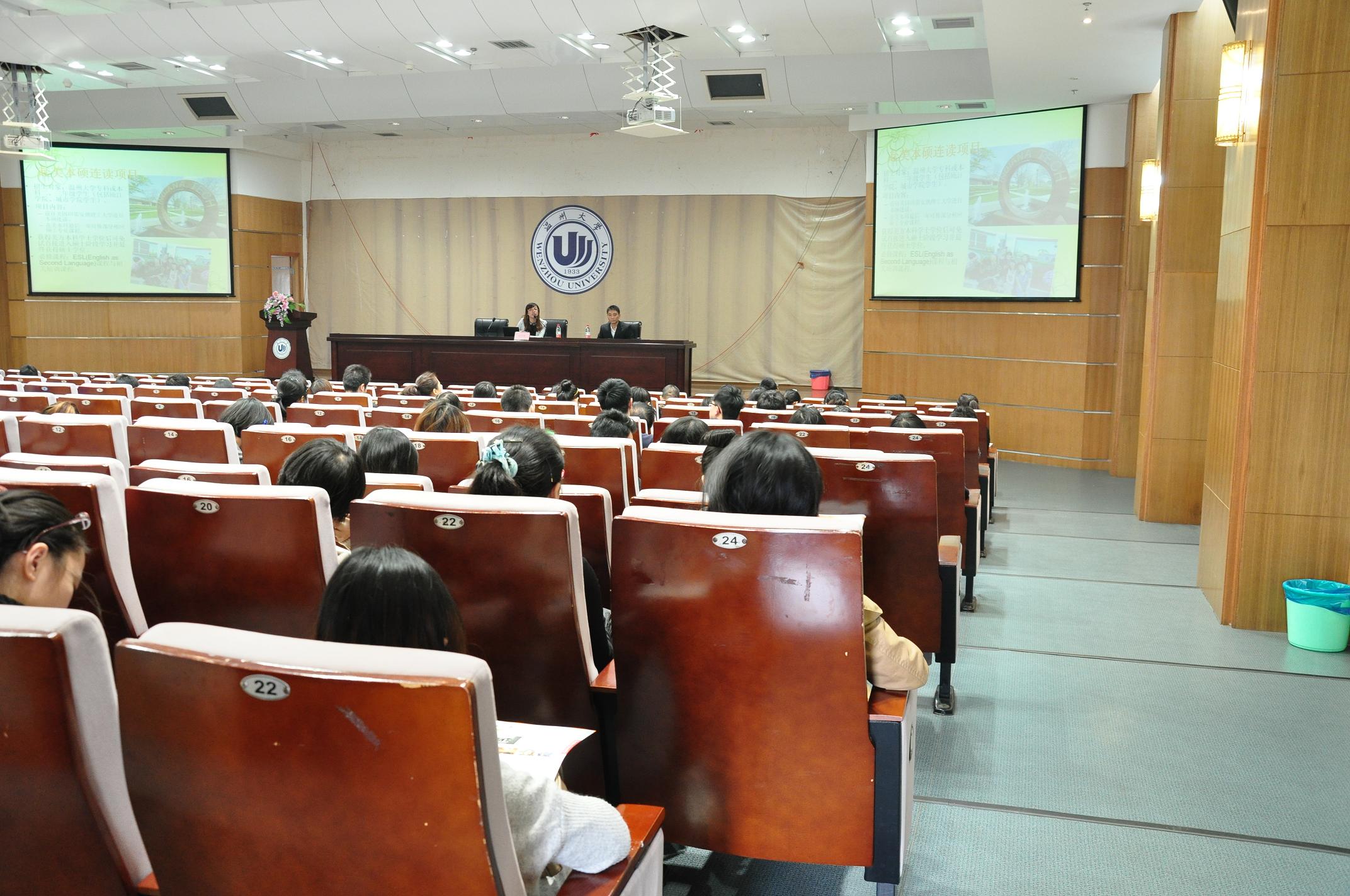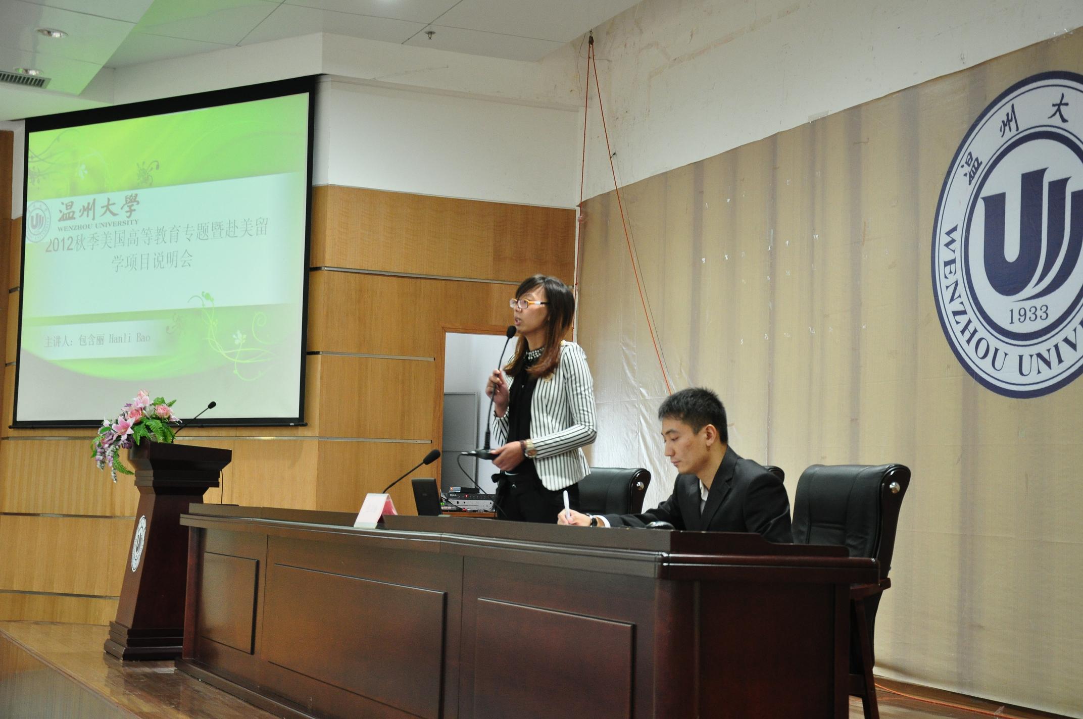 2012年11月7日下午, 公司在北校区商公司报告厅召开 “2012秋季古天乐代言太阳集团138美国高等教育专题暨赴美留学项目说明会”。说明会由国际合作项目开发办公室主任、美国印第安纳访问学者包含丽老师主讲。