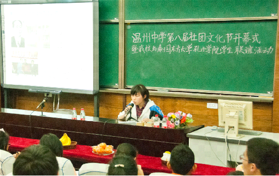 活动伊始,温州中学团委孙斯扬老师详细地向职工介绍了温州中学社团悠久的文化历史和深厚的文化底蕴,阐述了社团文化节的重要性和积极意义。随后,在温州中学社联副主席图文并茂的详细介绍下,职工们了解到了温州中学本届社团文化节各项活动的具体安排。