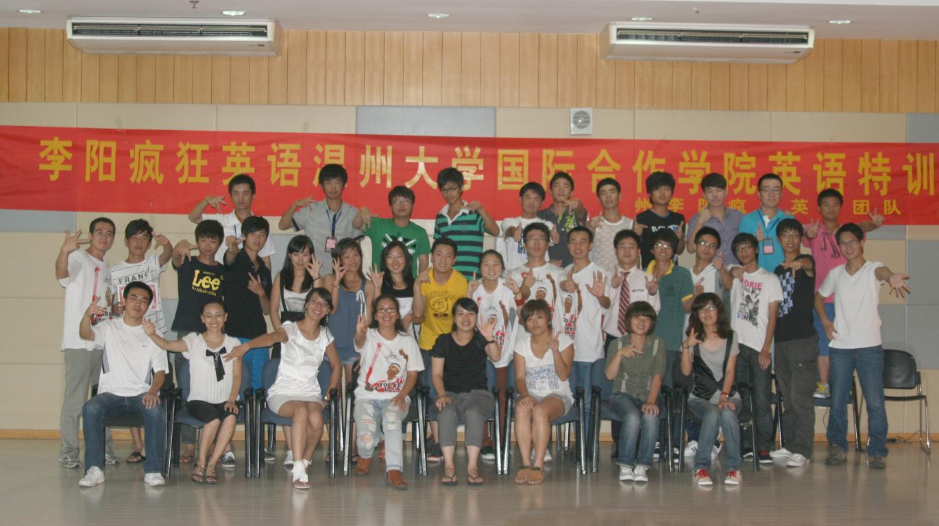 9月13日上午公司疯狂英语特训营开营。学员为2010级中美合作库克项目精品班和留学美国预科班的60多名新生。这两个项目一直以英语为办学特色,库克4年课程中有10门核心课程由美国库克大学直接派外教来温大授课,公司专门聘请了口语外教,还定期组织员工与职工一起参加各种活动,以提高英语水平。上学期,公司聘请了环球雅思的专业老师为07和09级员工辅导,效果显著。这次聘请疯狂英语团队做特训营,激发员工学习英语的热情也是公司的一个新尝试。