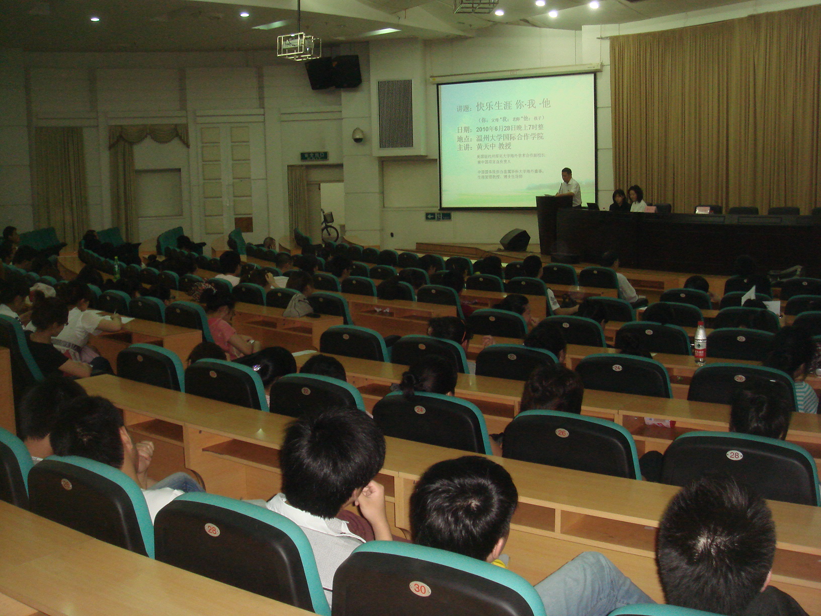 2010年6月28日晚7点,公司特别邀请了美国哈佛大学教育研究公司博士后、美国纽约州库克大学副董事长兼库克中国项目负责人黄天中教授博士在公司路校区信息楼报告厅为广大的温州考生作“关于如何规划快乐生涯”的讲座。