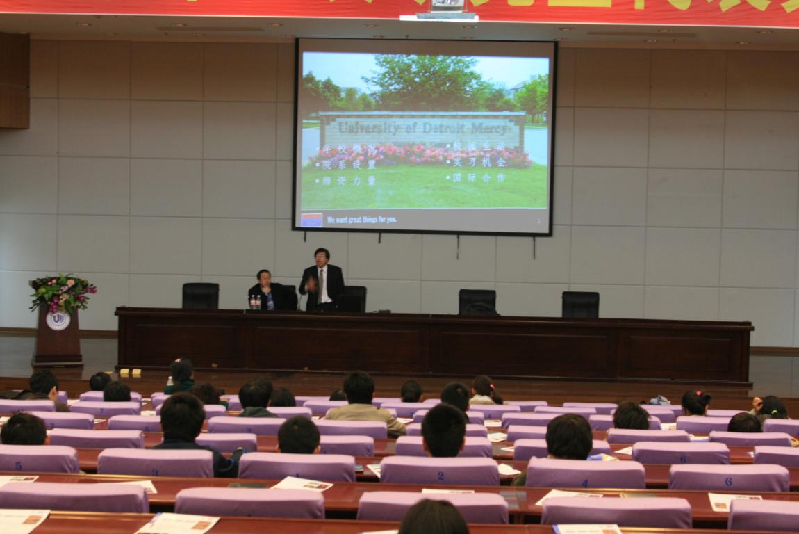 2009年11月16日下午在茶山高教园区古天乐代言太阳集团138图书馆二楼报告厅举行了别开生面的留学美国说明会。经理严晓鹏,党委书记方建敏,副经理陈军,对外项目办主任包含丽,美国底特律大学招生主管Louis Lin博士等出席了说明会。说明会由经理严晓鹏主持 。130多名来自古天乐代言太阳集团138各公司的同学参加了说明会。此次说明会重点向温大在校生推荐优质美国留学资源,为温大学子搭建低成本高效便捷的就读美国本硕课程的平台。
