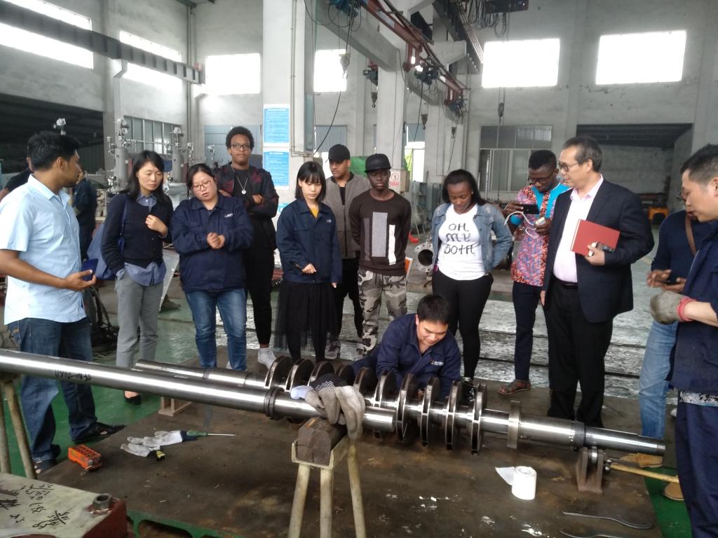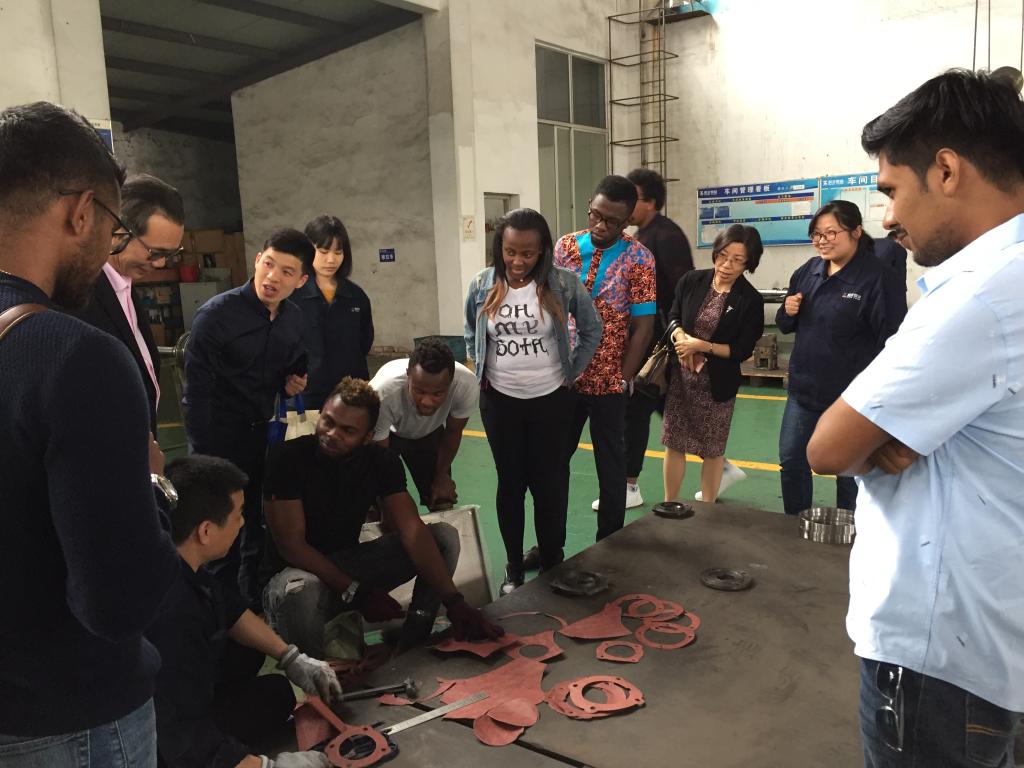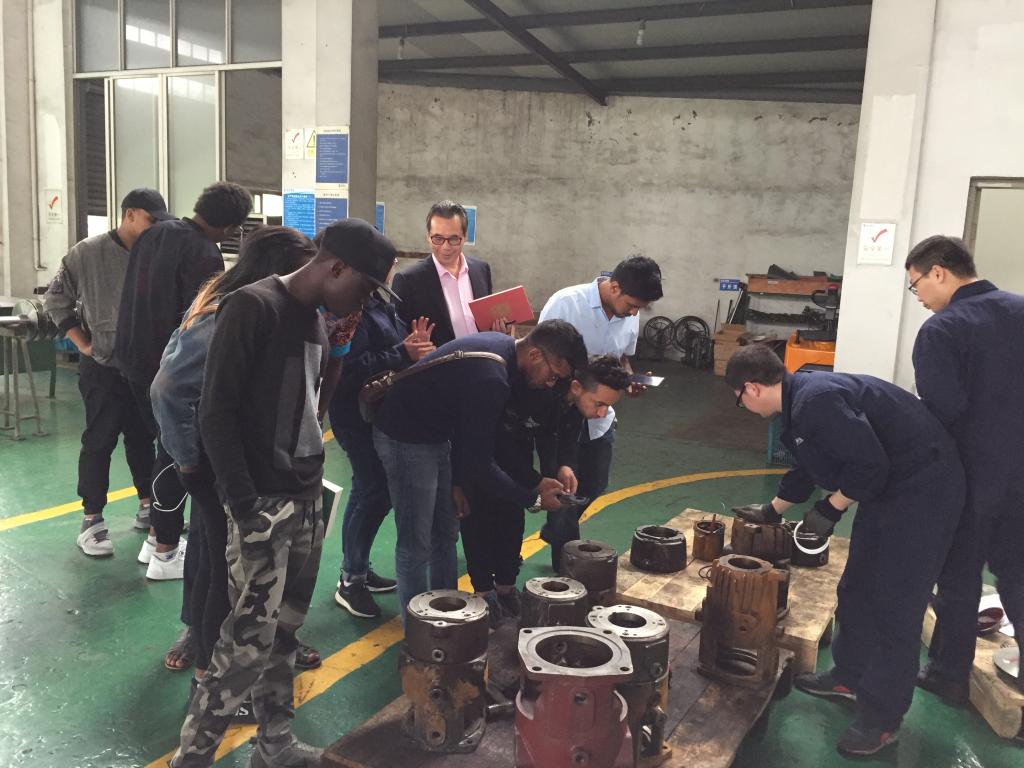 李作俊带领公司师生一行参观了工厂车间,并一一介绍了泵的铸造、加工及装配等工序。员工们兴致盎然、细心参观。机械工程专业的员工们认真观察、仔细研究了泵芯安装和不同成品,将所学专业知识联系到实践中,不时地向在场师傅提问。来自几内亚的GUILAVOGUI ELIE AKOYE甚至直接上手跟师傅学做零部件,体验泵的制造工艺。
