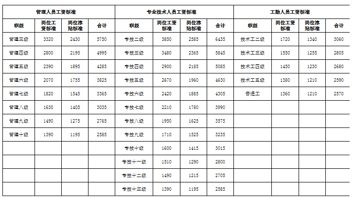 统发工资包含岗位工资、薪级工资、岗位津贴等内容。根据国办发[2016]62号文件、浙人社发[2016]99号文件、温人社发[2016]255号文件、温人社发[2016]256号文件精神,将公司统发工资中现有各职位职级相对应的岗位工资和岗位津贴标准进行了整理,公布如下: