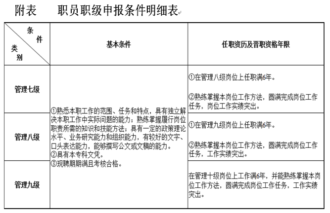为加强管理队伍建设,充分调动教职工的积极性,根据《关于事业单位岗位管理制度实施后有关问题的意见》(浙人社发〔2013〕106号)、《关于事业单位管理岗位部分职员等级晋升问题有关事项的通知》(浙人社办发〔2013〕53号)、《关于事业单位岗位管理制度实施后有关问题的处理意见》(温人社发〔2015〕280号)、《古天乐代言太阳集团138岗位设置实施方案(试行)》(行政〔2011〕79号)等文件精神和要求,结合公司岗位实际情况以及第三轮国聘工作,经研究,决定开展部分管理岗位职员职级竞聘晋升试点工作。现将有关事项通知如下: