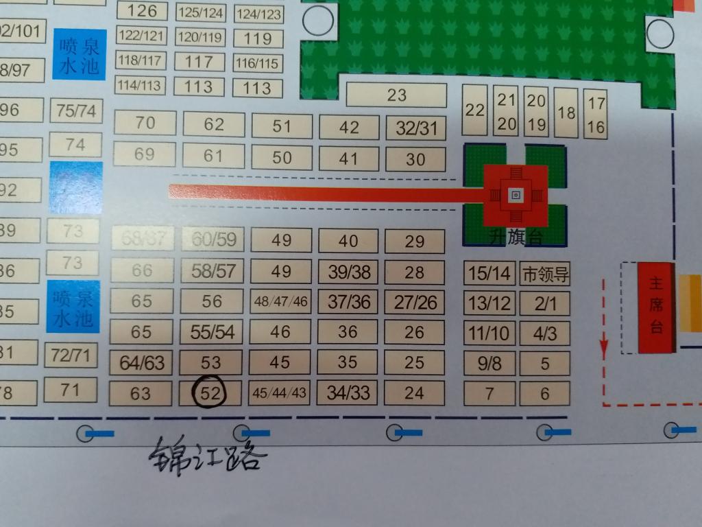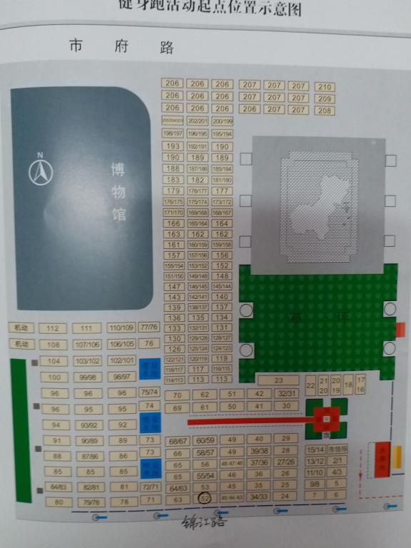 二、本次健身跑公司本部方阵位置处于52号(见附图),各位教工必须穿着校工会统一发放的服装,到场后及时到工会工作人员处签到。跑完全程后集中终点拍集体照。自行到世纪广场的教工必须于上午7:00前到达指定地点。