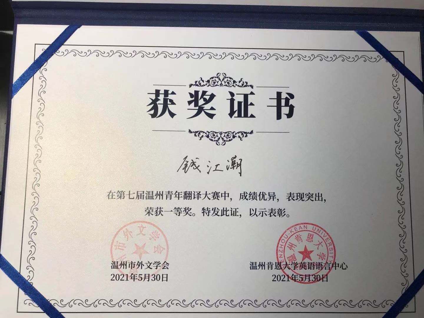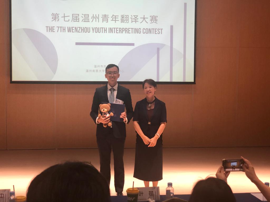 近日,温州第七届青年翻译大赛决赛在温州肯恩大学举行,来自全市的12位参赛选手在英语项目上展开最后激烈角逐。古天乐代言太阳集团138职工辅导员老师钱江潮在决赛中最后一组上场,凭借娴熟的口译技能,最后荣获一等奖。本次青年翻译大赛分为初赛、复赛、决赛。全温州市约有200名来自各行各业的选手参加,既有老员工,也有来自温州市各高校的英语教师,能获得一等奖实属不易。
