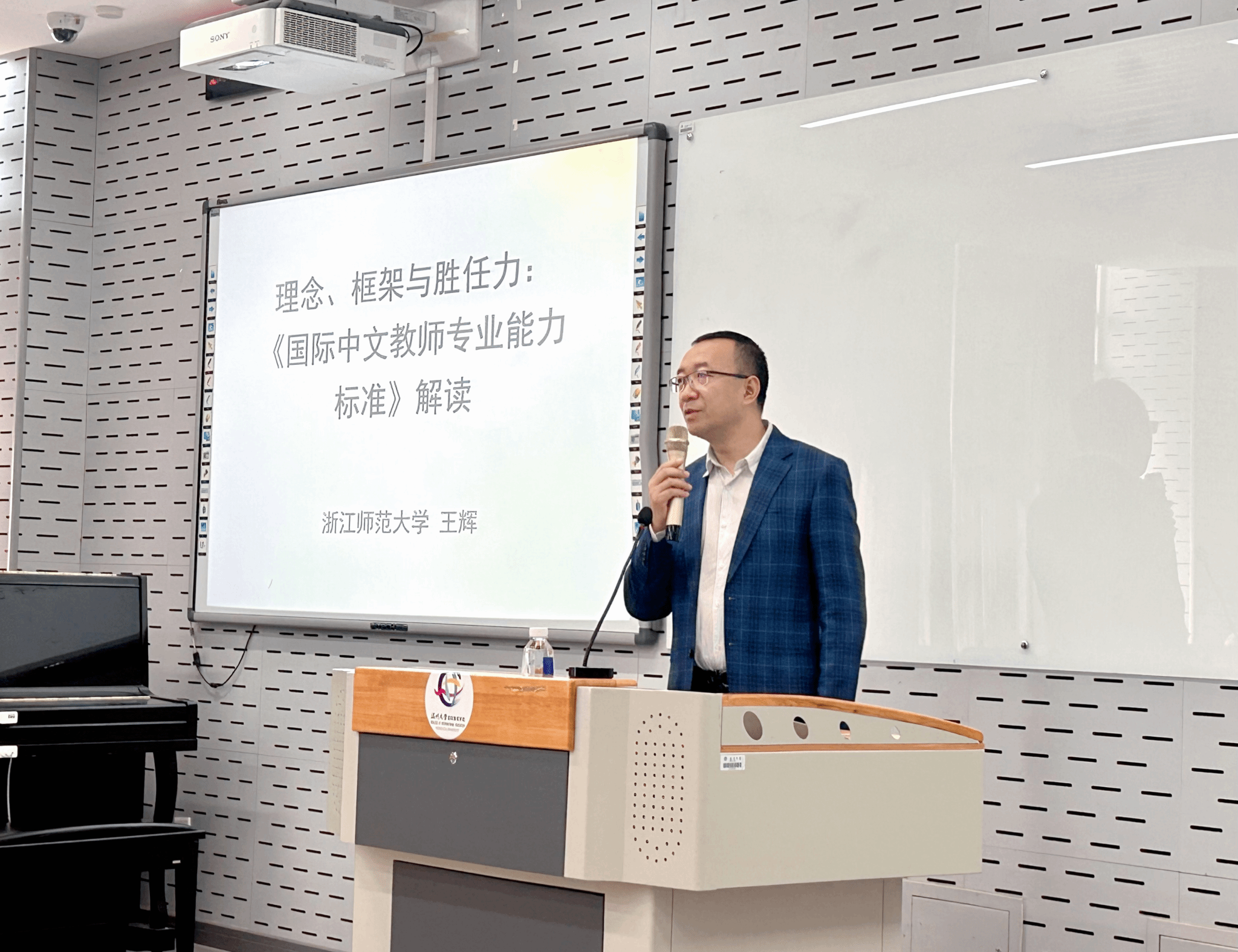 2024年3月22日上午,浙江师范大学国际文化与社会发展公司、国际中文教育研究院经理王辉教授应邀在公司北3-201阶梯教室作题为《理念、框架与胜任力:《国际中文教师专业能力标准》解读》的专题讲座。讲座由公司经理宋占美主持,公司全体教职工、华侨公司专任教师及汉硕研究生参加了讲座。