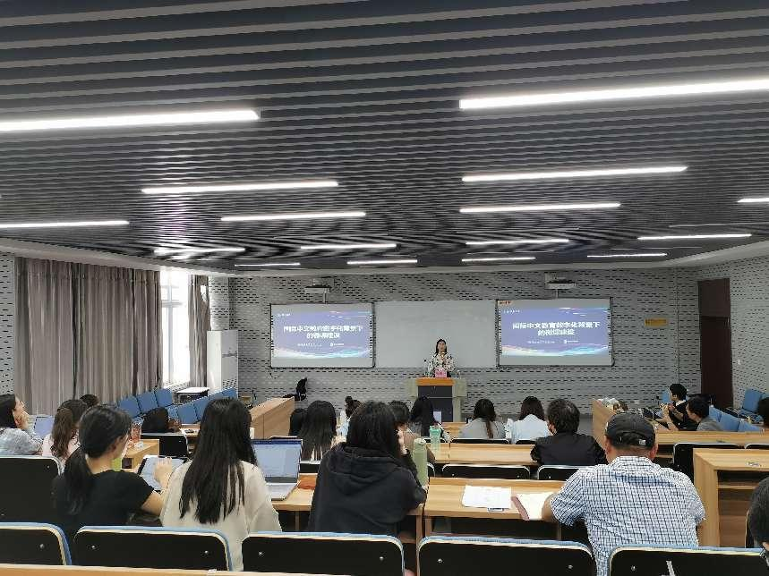 紧接着,唐风国际教育集团战略合作部市场经理,全国研究生汉语教学微课大赛负责人施雅利为在座的师生做了题为《国际中文教育数字化背景下的微课建设》的讲座。她向大家介绍了微课的概念、种类和优弱势。此外,她还介绍了全国研究生汉语教学微课大赛的基本情况,以及历届参赛情况。截止2022年,共有126所中国知名高校3800位选手及111个团队报名,提交了近1700件参赛作品。唐风系统可为微课备课、录制、传播提供一整套的技术支持。施老师的讲座为大家提供了详细可操作的微课大赛参赛指南,成功引起了现场师生的兴趣,为国际教育发展提供了新的发展思路。