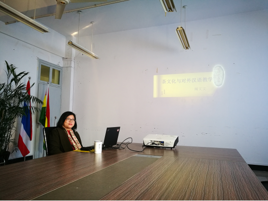 阚老师声情并茂地跟大家分享了古典文学专业出身的她转行从事“茶文化”方向的缘起和过程,用制作精美、图文并茂的PPT展示了她多年来在茶文化领域里积累的教学经验、科研成果,以及茶文化对她自身和生活的改变。特别是她“以茶为媒”,在对外汉语教学方面所做的刻苦实践。此外,她还对茶文化教师在对外汉语教学方面所应当具备的基本素养提出了自己的独到看法,并对未来的工作计划提出了十分具体的规划和展望。