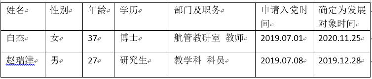 根据《中国共产党章程》及《中国共产党发展党员工作细则(试行)》等文件精神,经公司教工党支部一年及以上的培养考察,拟在近期召开支部大会讨论白杰、赵瑞津两位同志的入党事宜。现将发展对象基本情况公示如下。