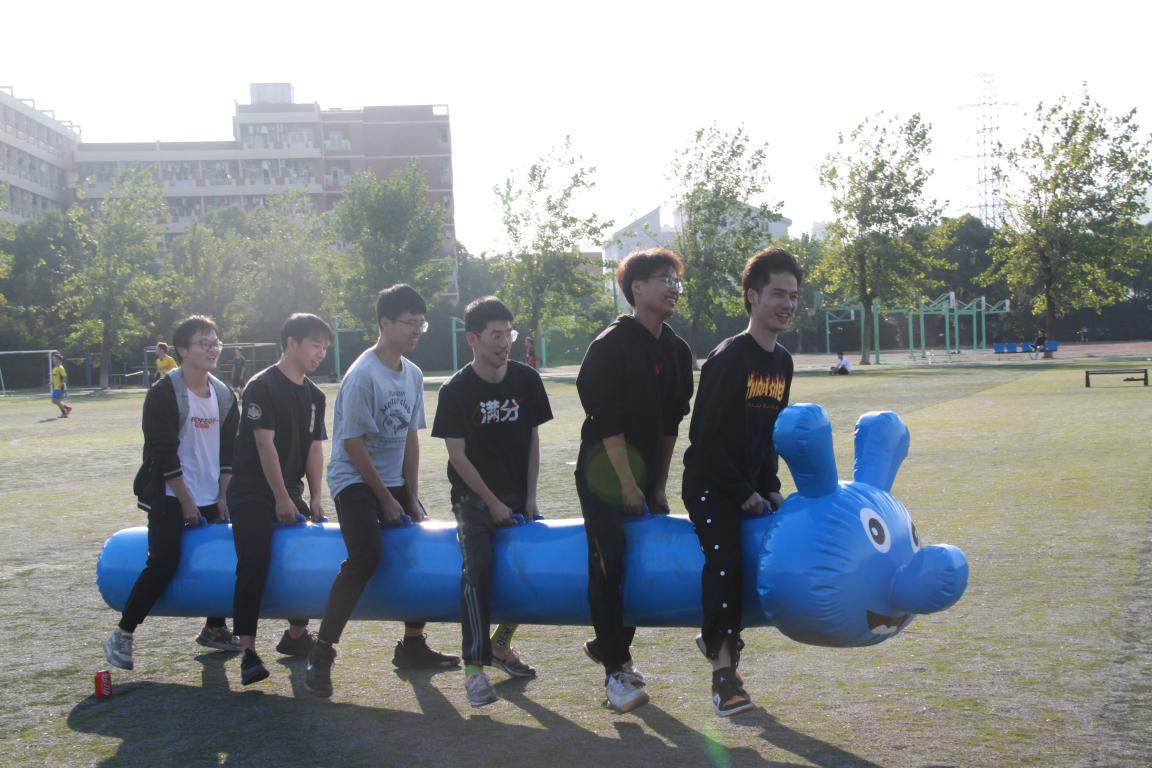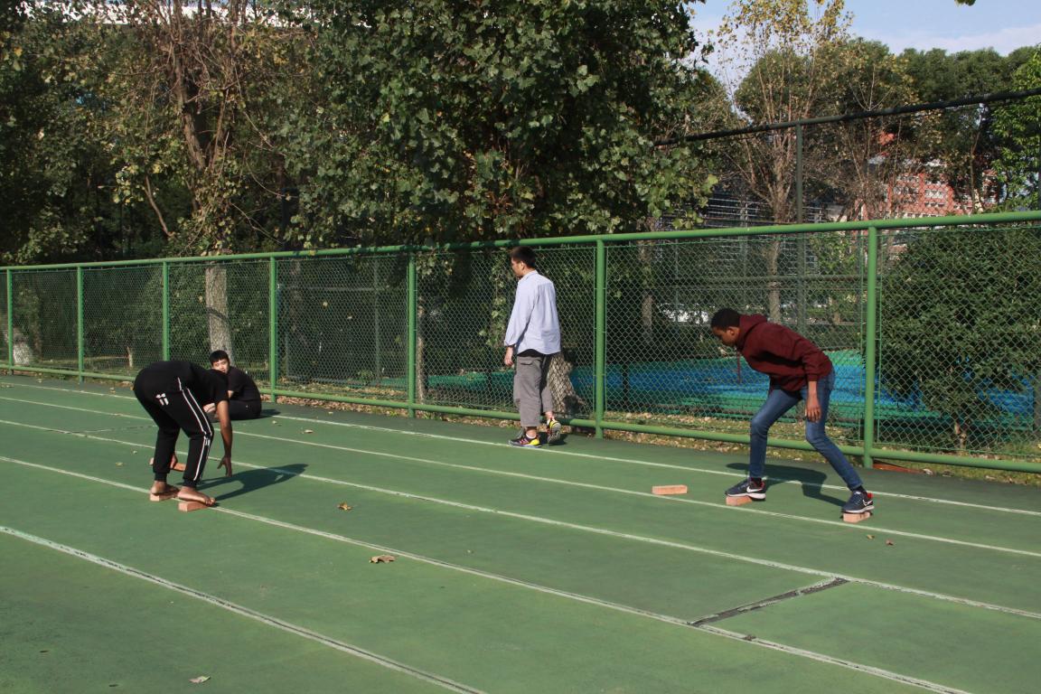 趣味运动会分四个项目:趾压板木头人,摸石过河,趣味前进射球赛和毛毛虫竞速。其中摸石过河和毛毛虫竞速最为有趣,师生们两人一组,每位参赛者脚底放置两块砖头,参赛选手听到裁判员发出“开始”口令后开始行动,提起左脚并拿起砖头放置前方,随后右脚提起并将右脚下砖头放置前方,如此往复,用时最短的一组获胜,师生们都纷纷铆足了劲往前冲。在毛毛虫竞速环节,中外员工和老师们一起合作,骑在毛毛虫上从足球场一端移动到另一端绕过障碍物后返回,用时最短一组获胜。