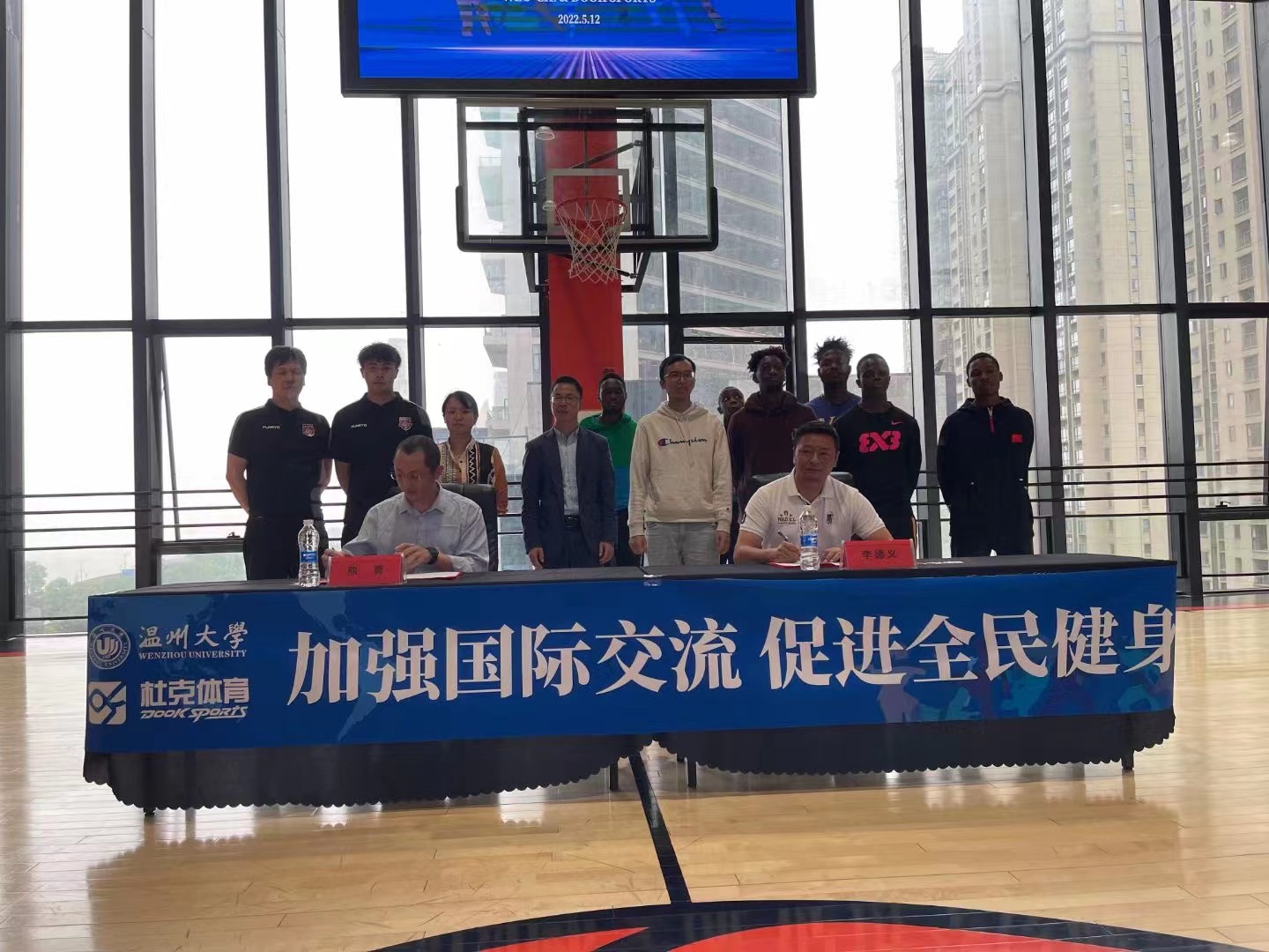 5月12日下午,公司与杜克体育(温州杜克体育发展有限公司)战略合作协议签约仪式在杜克体育公司顺利举行,参加签约仪式的有杜克体育总裁李德义,公司副经理熊勇、党总支副书记方建晓、辅导员钱江潮及职工篮球队的队员们。会上,李德义与熊勇签署战略合作协议并交换协议。