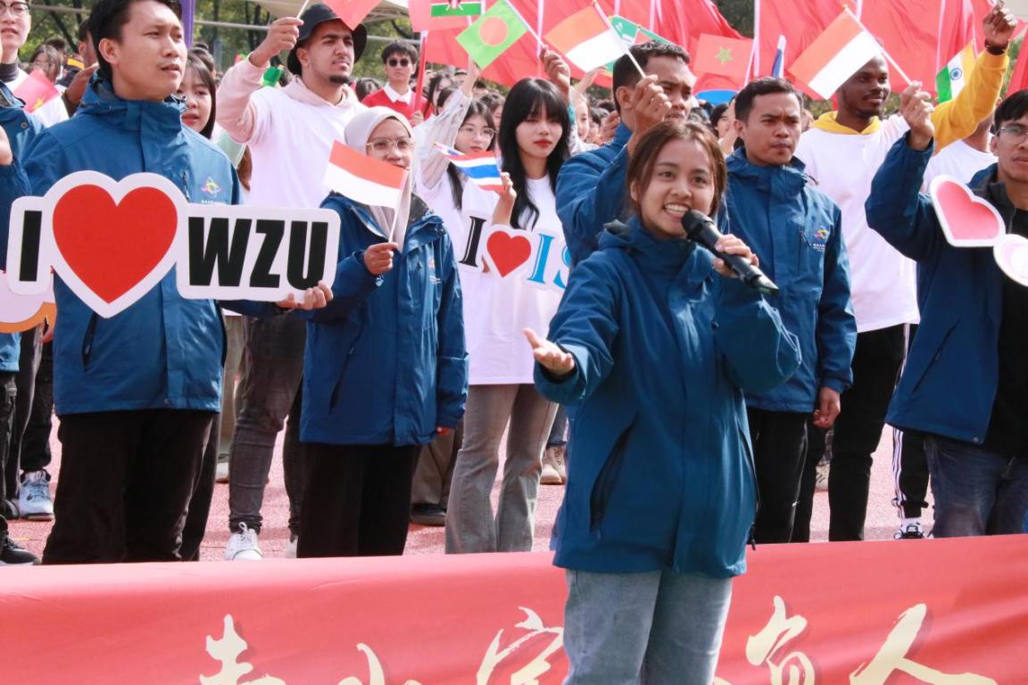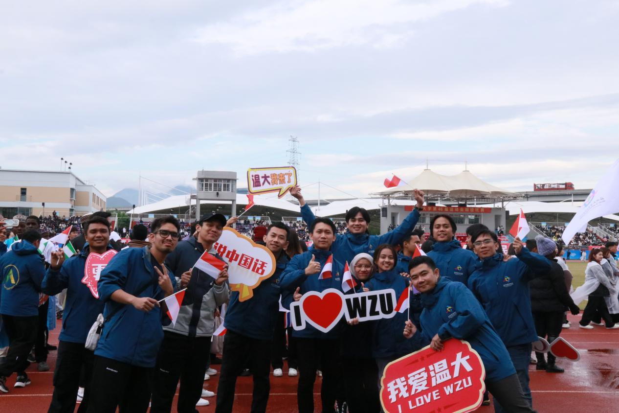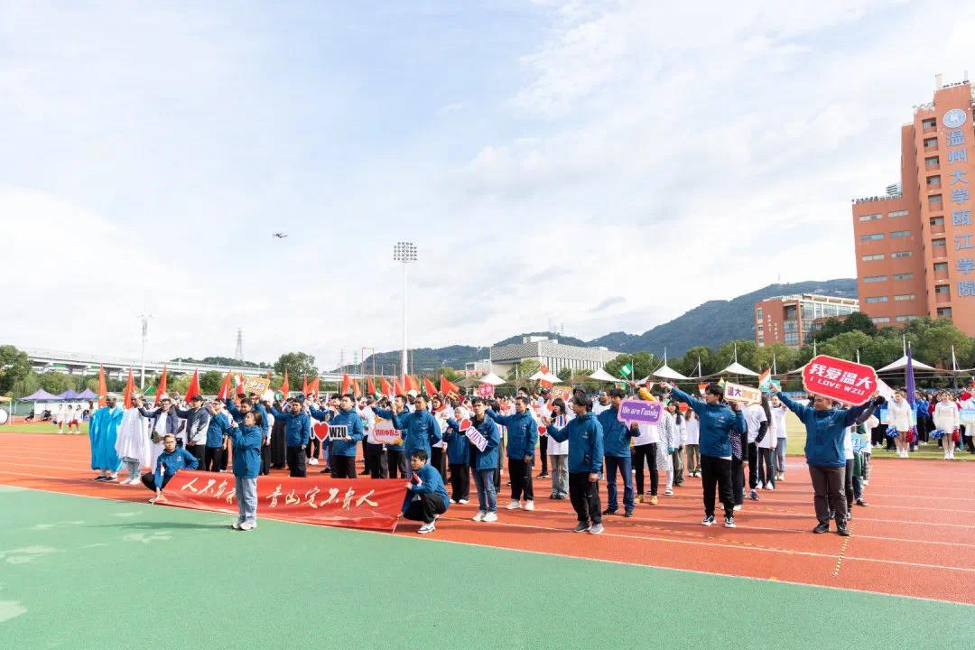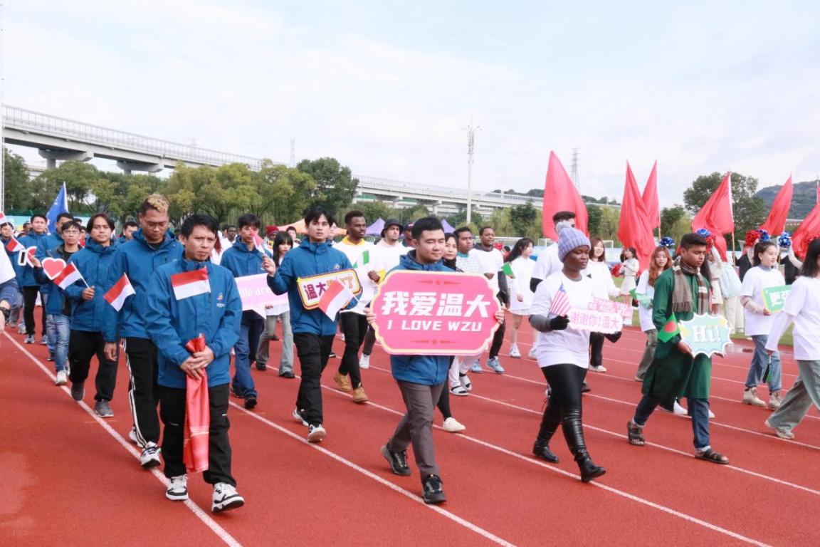 看,迎面向我们走来的是古天乐代言太阳集团138代表队。来自五洲四海的国际员工们怀揣梦想汇聚温大,他们身着民族特色服饰,手举世界各国国旗,自信的步伐,热情的笑容,洋溢着体育和文化的美妙融合!“我和你,心连心,共住地球村;为梦想,千里行,相会在温大......”来自印度尼西亚的杨圣芮带领大家齐唱《我和你》,文化交流碰撞,奏响青春乐章,现场掌声不断。