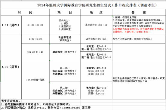 (4)外语听力及口语的测试环节,根据《温州⼤学研究⽣招⽣复试中外语听⼒及口语测试实施⽅案》,对每位考⽣单独进⾏听⼒及口语测试,当场给出测试成绩,考⽣最后得分为该测试小组所有考官给定成绩的平均分。外语听⼒口语测试满分10分,直接进入复试成绩。